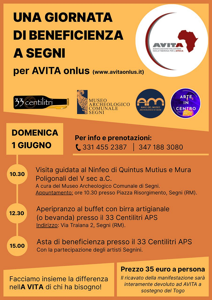 AVITA Onlus è lieta di invitarvi a una giornata speciale dedicata alla solidarietà e alla cultura. Domenica 1 giugno, vi aspettiamo per un’esperienza unica che combina storia, buon cibo e generosità. Dalla visita guidata alle meraviglie archeologiche di Segni, all’aperipranzo con birra artigianale, fino all’asta benefica Ogni momento sarà un’opportunità per contribuire a una causa importante: sostenere il Togo.
